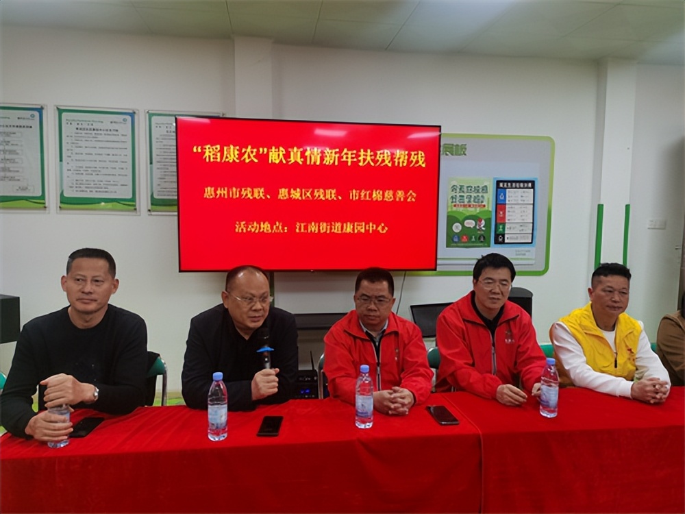 2023年12月28日上午,在惠州市残疾人联合会、惠城区残疾人联合会指导下,惠州市红棉慈善会与稻康农(广东)农业科技发展有限公司共同组织开展“稻康农"献真情,新年扶残帮残 ”为主题的慰问活动。市残联领导、区残联领导、市红棉慈善会会长“广东好人”李鸿国,红棉秘书长彭开勤,稻康农负责人执行董事 廖荫煌,稻康农公司总经理卢泽阳、副总经理郑道名以及商学院讲师团成员姚蓉、谢仁辉等员工和志愿者们一起来到惠城区江南康园康复中心参与迎新年慰问活动。