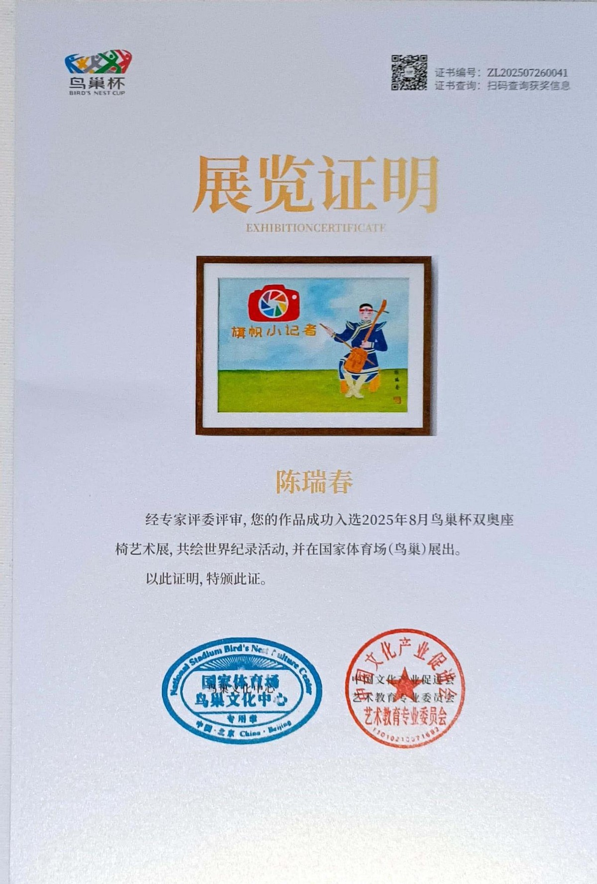 据悉,2025年8月12日至14日,鸟巢杯文化艺术展组委会在双奥鸟巢举办“鸟巢杯艺术盛典”,为陈瑞春颁发了《展览证书》、《收藏证书》、《世界记录扛旗证书》,并对其进行了表彰。