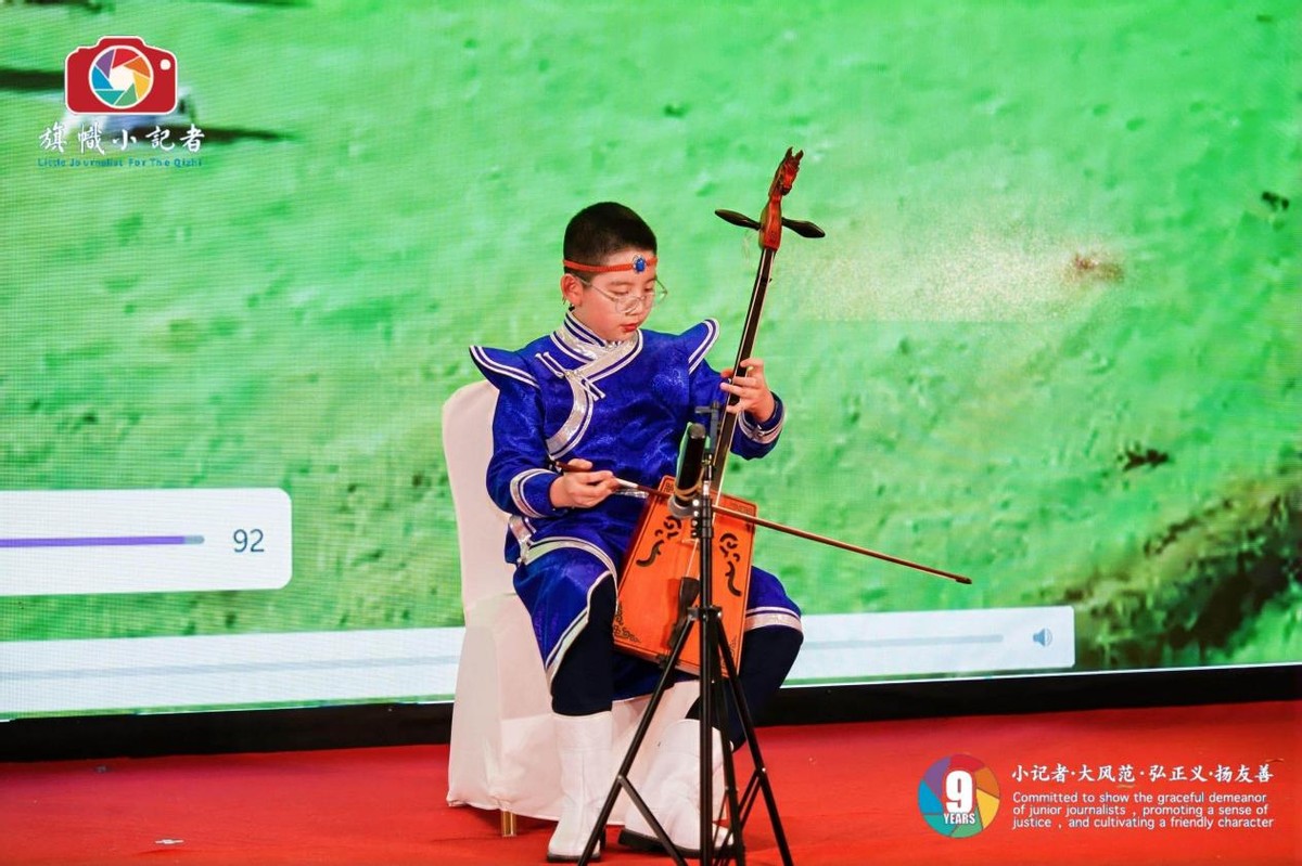 画作的是旗帜小记者张桓语在旗帜小记者成立九周年庆典演奏马头琴。张桓语同学是五星旗帜小记者,曾获内蒙古呼伦贝尔市”乐高智乐杯”少儿组第一名,内蒙古农商银行杯”马头琴大赛二等奖,内蒙古阿尔山市”小小马头琴传承人”荣誉称号,第五界”丝绸之路”中国——白俄罗斯国际青少年艺术马头琴大赛二等奖,教育部白名单赛事第五届”致敬英雄”朗读演讲大赛省赛第二名,“全球通”中医文化国际传播大使,2025年河北省三河市级、校级三好学生,获得环球少年国际青少年文化艺术交流语言表演类一等奖,2025年获得北京电视台文艺频道2025新春大联欢“金牌小演员”称号。